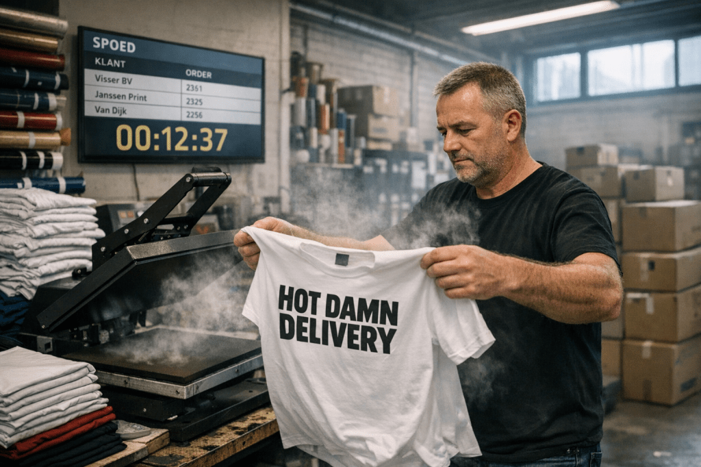 De keuze voor de juiste druktechniek bepaalt grotendeels hoe snel je shirts klaar kunnen zijn. Digitale transfers en DTG-printing (direct-to-garment) zijn ideaal voor kleine oplages en kunnen vaak binnen 24 tot 48 uur geleverd worden, omdat er geen uitgebreide voorbereiding nodig is. Zeefdruk daarentegen vraagt meer tijd vanwege het maken van zeven voor elke kleur in je ontwerp. Heb je een eenvoudig design met beperkte kleuren? Dan zijn flexfolie en vinyldruk uitstekende opties met een razendsnelle doorlooptijd. Bespreek altijd je deadline met de leverancier om de beste techniek te kiezen.